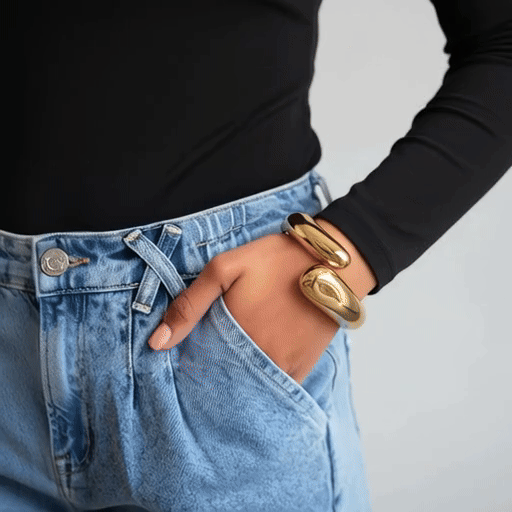 Sculpé dans des courbes modernes et féminines, ce bracelet doré apporte une touche d’audace à n’importe quelle tenue. Sa forme ondulée épouse délicatement le poignet et capte la lumière à chaque mouvement, pour un rendu à la fois chic et sophistiqué.