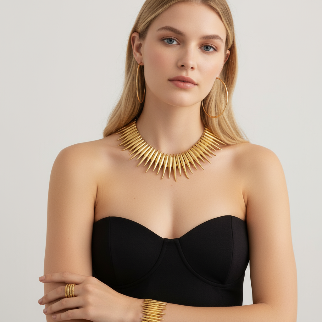Audacieux, lumineux et incroyablement sophistiqué, cet ensemble doré composé d’un collier, d’un bracelet et d’une bague est une véritable pièce maîtresse. Ses éléments finement sculptés créent une silhouette éclatante qui attire instantanément le regard et sublime le port de tête.